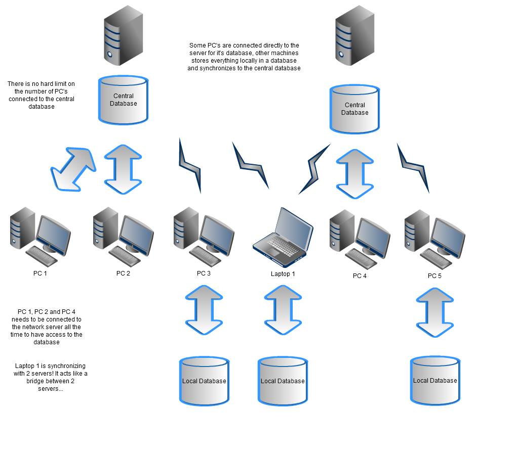 No exemplo acima, isto quer dizer que uma folha de pictos criada por um uyilizador no PC 1 será guardada no primeiro servidor. O portátil 1 será sincronizado com esta base de dados e guardá-la localmente. Mais tarde, sincroniza a folha com outro servidor e finlamente, o PC 5 terá a folha sincronizada.